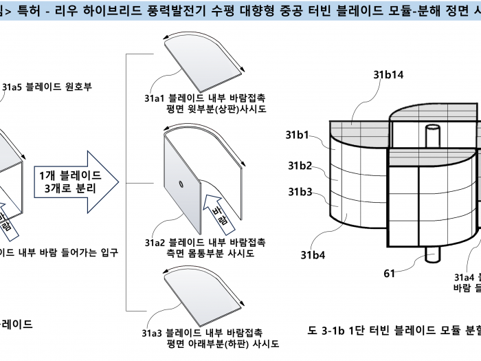 특허 - 리우 하이브리드 풍력발전기 수평 대향형 중공 터빈 블레이드 모듈-분해 정면 사시도
