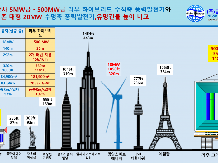 당사 5MW급ㆍ500MW급 리우 하이브리드 수직축 풍력발전기와 기존 풍력발전기-비교-그림