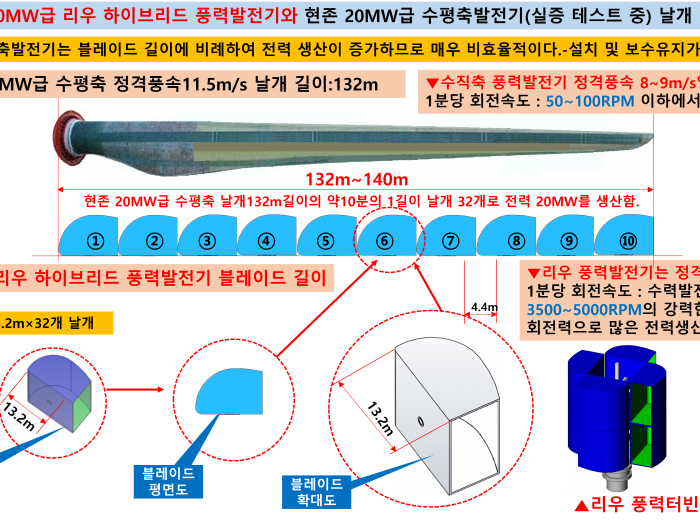 20MW 급 리우 하이브리드 풍력발전기와 세계최대 20MW급 중국 수평축 발전기 날개-10분의1 크기 비교…