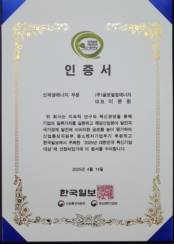한국일보 주최 산업통상자원부 및 중소벤처기업부 후원 "2025 대한민국 혁신기업 대상(신재생에너지 부문) 수상- 상패 및 인증서
