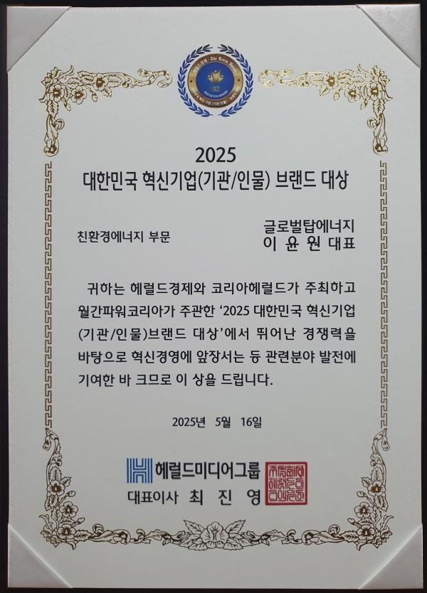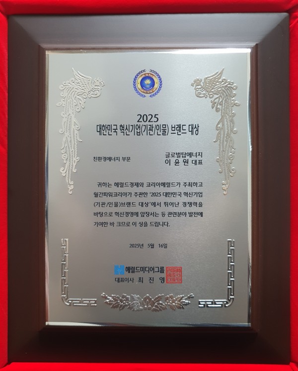 헤럴드경제 주최 주식회사 글로벌탑에너지- "2025년대한민국혁신기업(기관-인물)-브랜드 대상"_수상-상패 및 인증서
