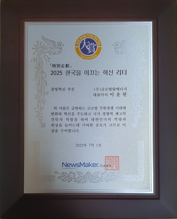 뉴스메이커 주최, 주식회사 글로벌탑에너지 2025 한국을 이끄는 혁신리더 대상(경영혁신 부문) 수상